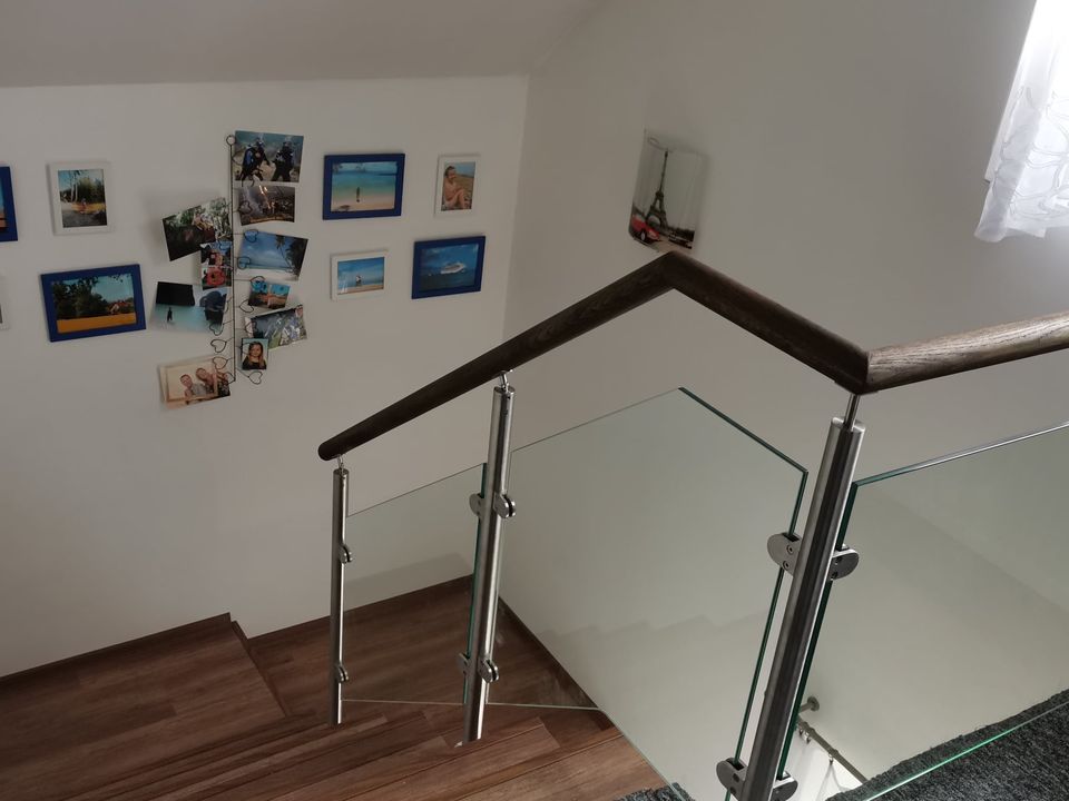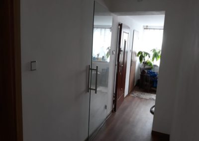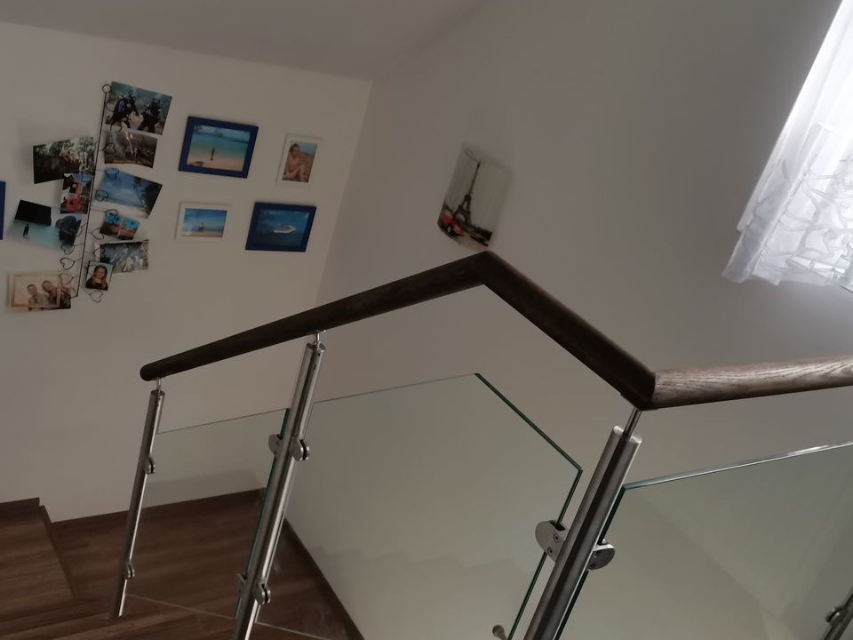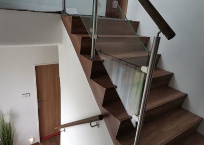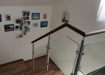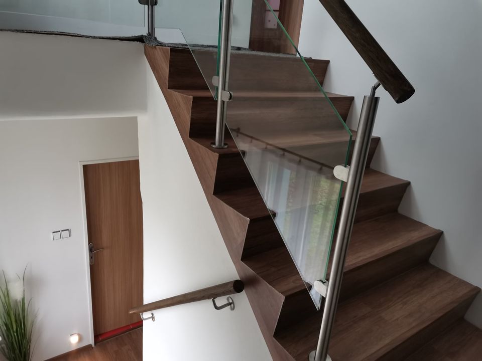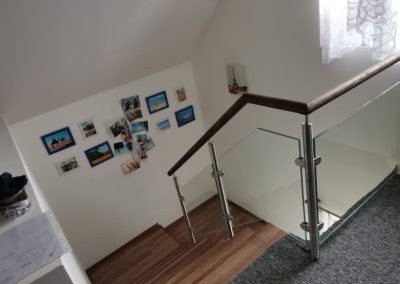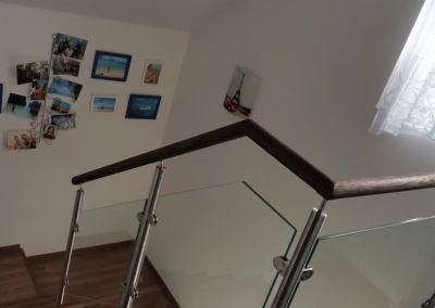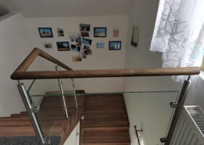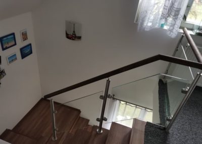 Montáž zábradlí v kombinaci nerezových sloupků, výplně čiré sklo o síle 10mm a jasanové madlo. Usazení skleněných dveří.
