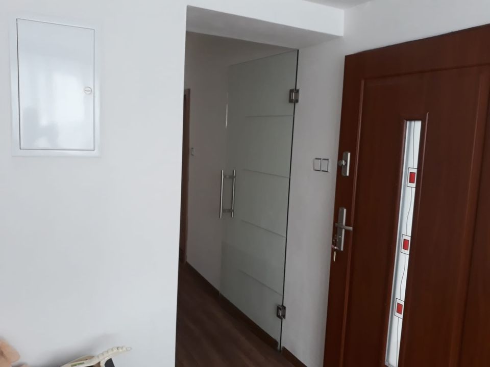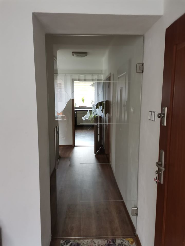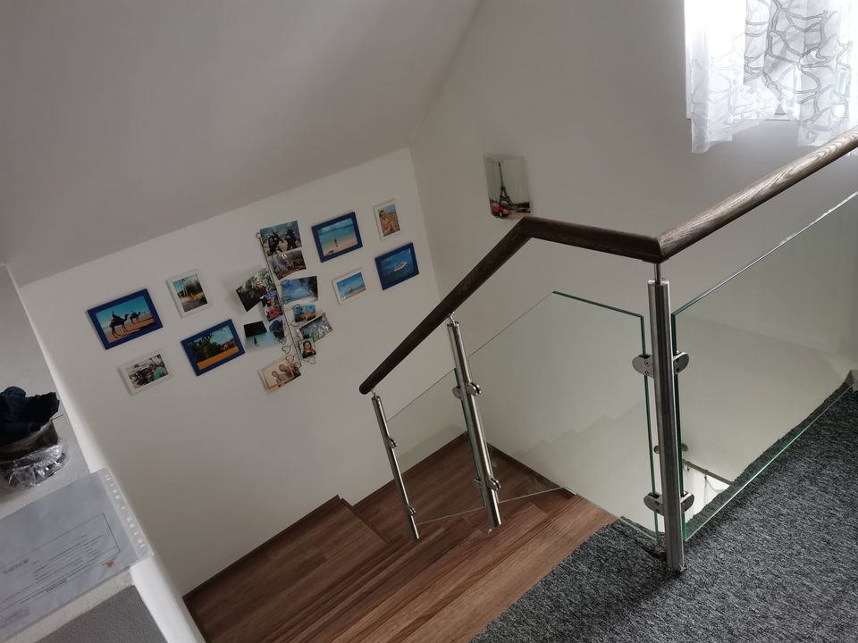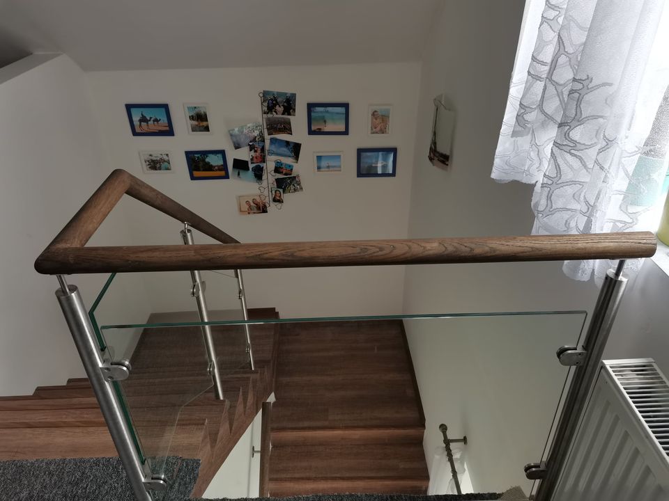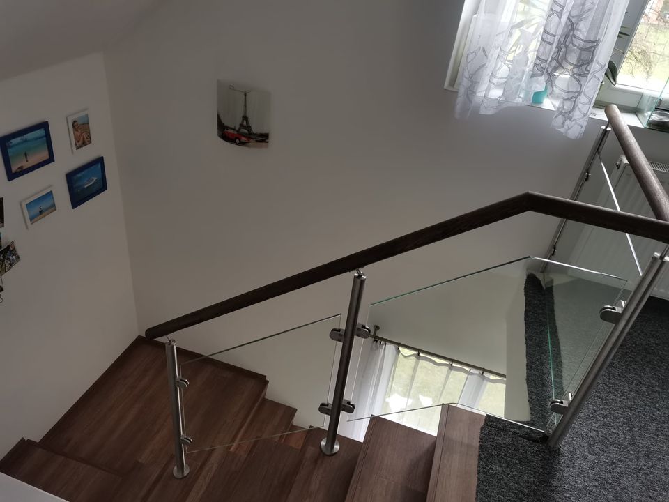 Montáž zábradlí v kombinaci nerezových sloupků, výplně čiré sklo o síle 10mm a jasanové madlo. Usazení skleněných dveří.