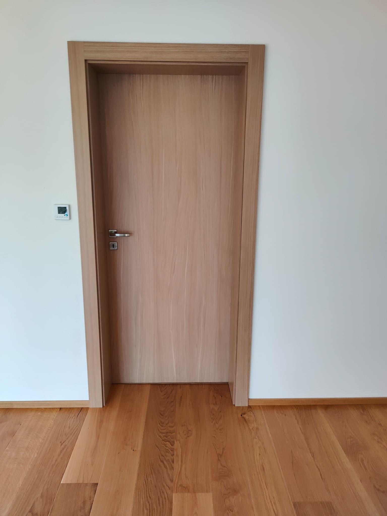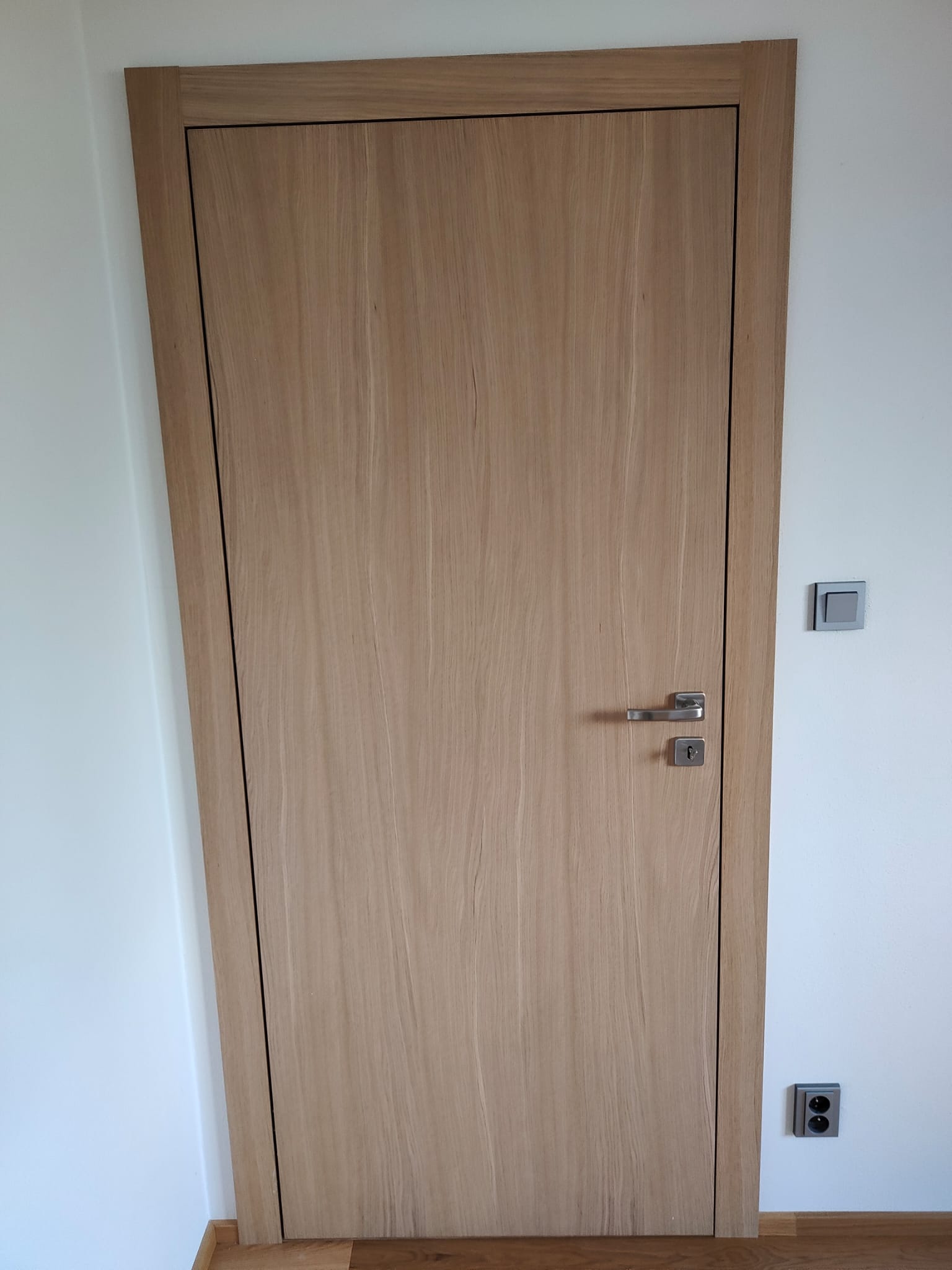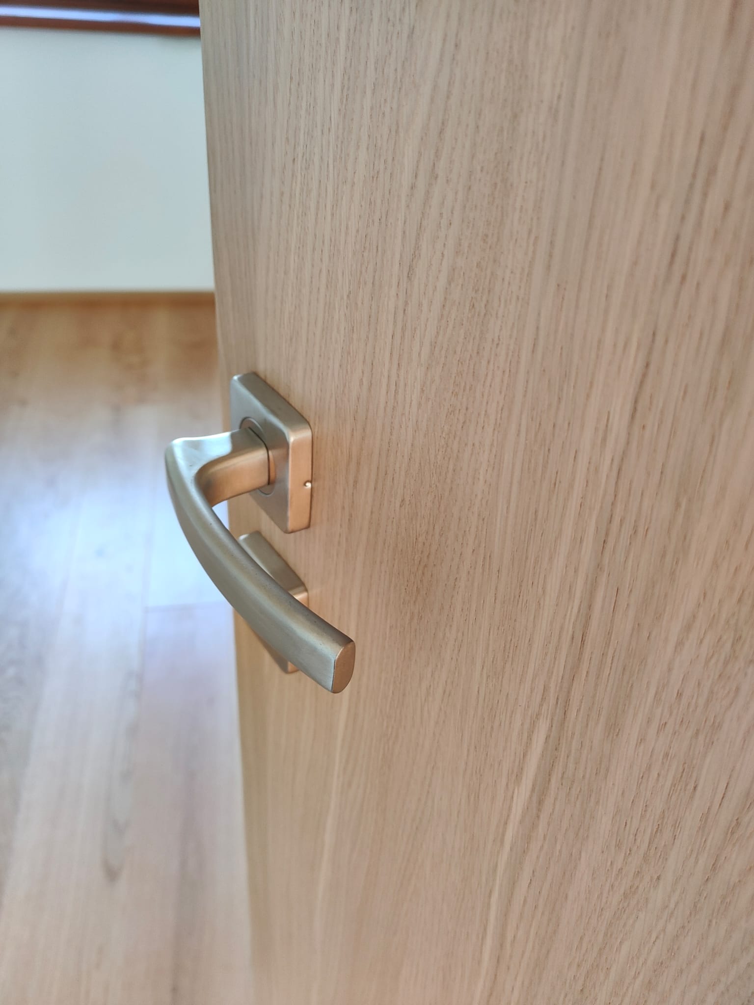Dýhované dveře i dřevěná podlaha spolu krásně ladí a tak dodávají hřejivý nádech pravého dřeva do interiéru 🪵🌳🚪.