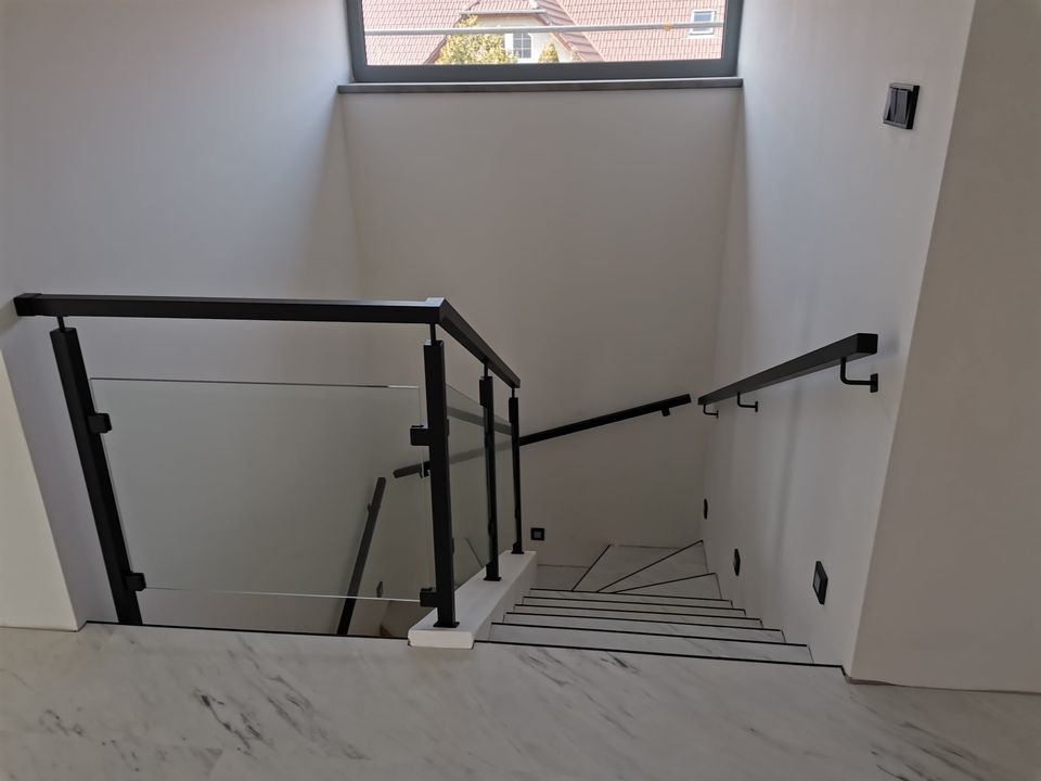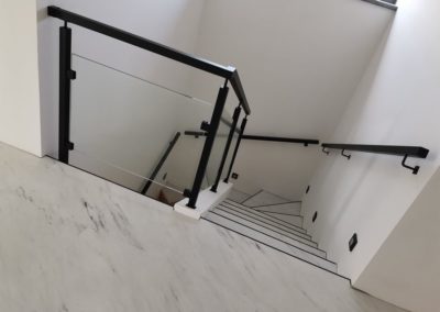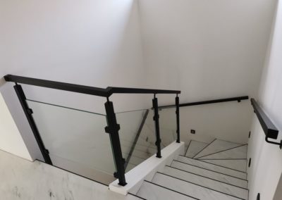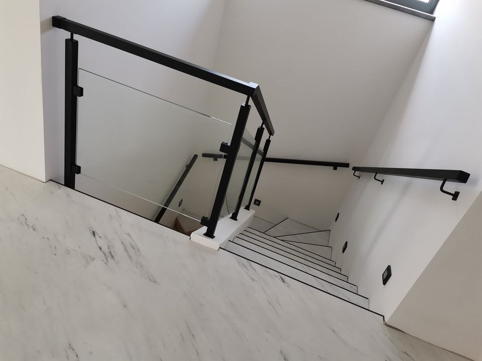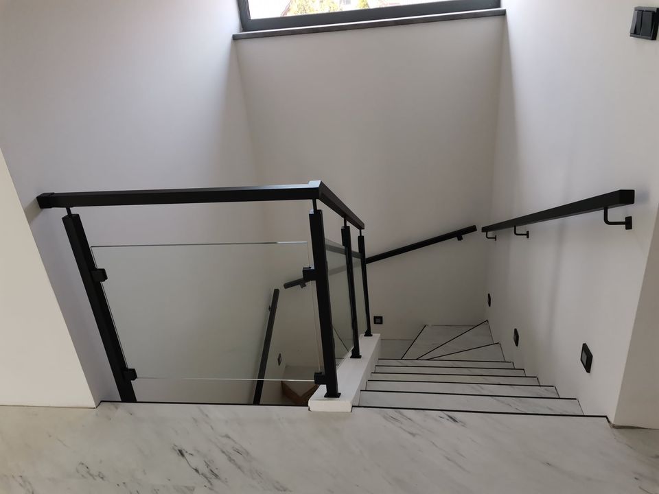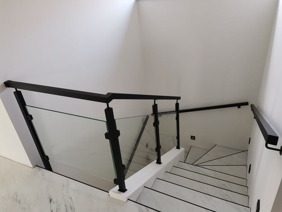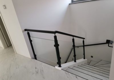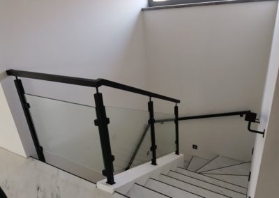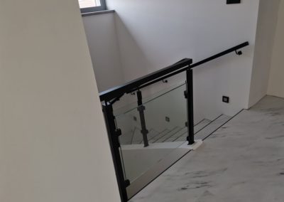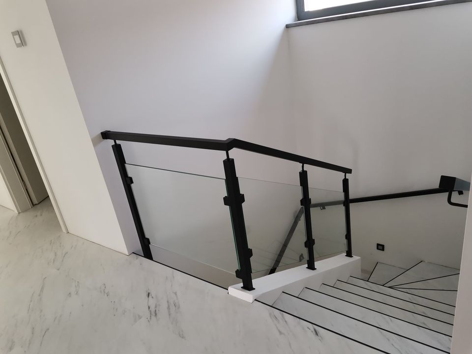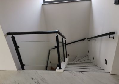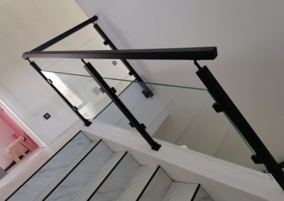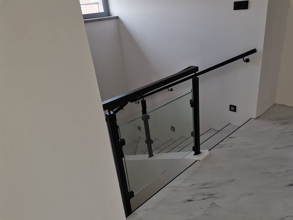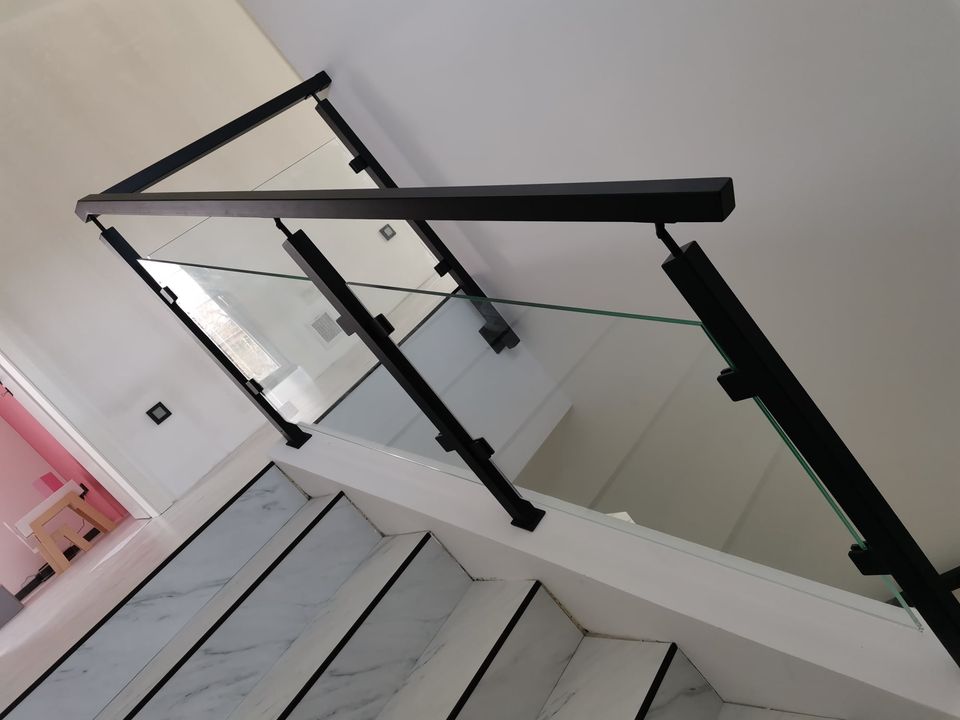 Sloupy a madlo černé barvy skleněné výplně, montáž madla na zeď. S černými doplňky nevypadá zle ????.
