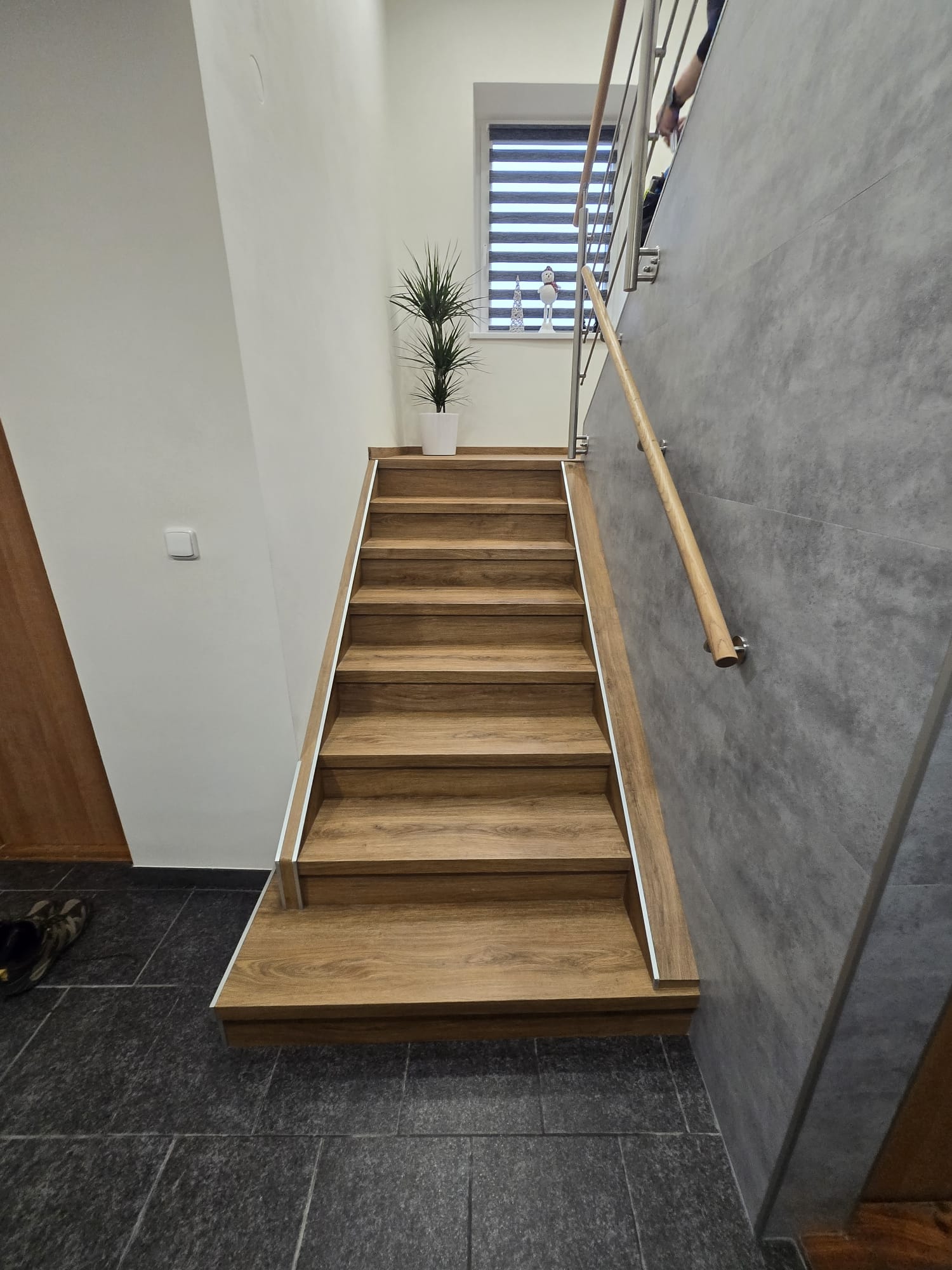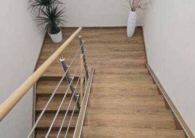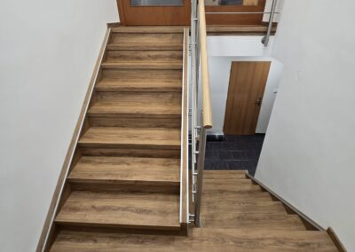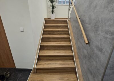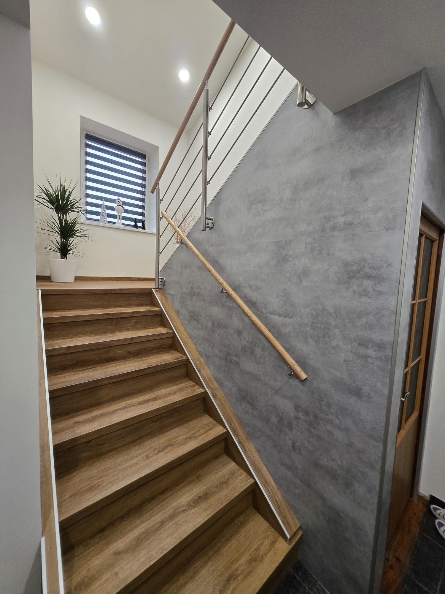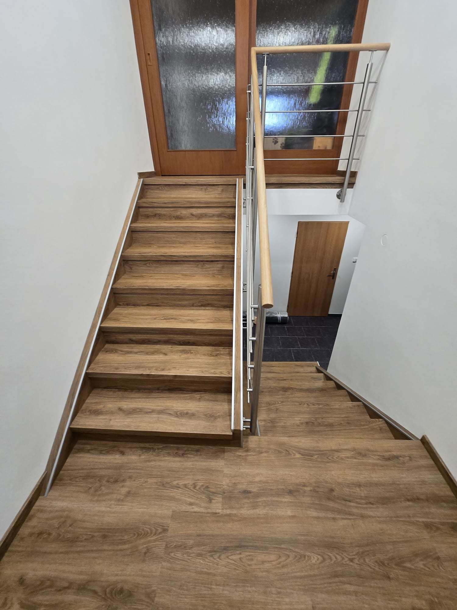 Staré schody jsme oblékli do nových vinylových stupňů, stěnám dopřáli stylový vinylový kabátek a celé to korunovali vkusným zábradlím, které ví, že méně je někdy víc.