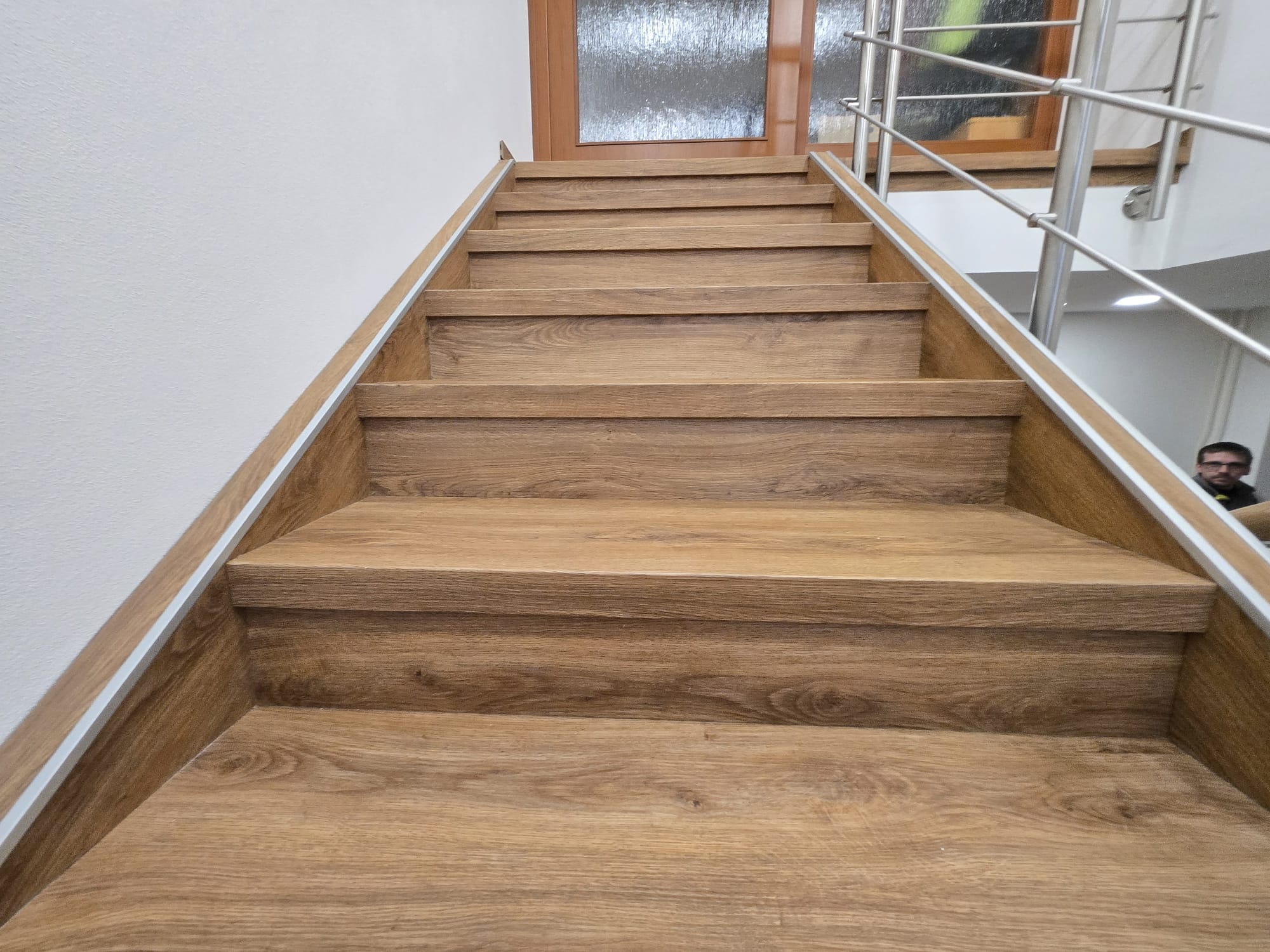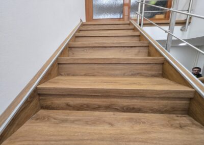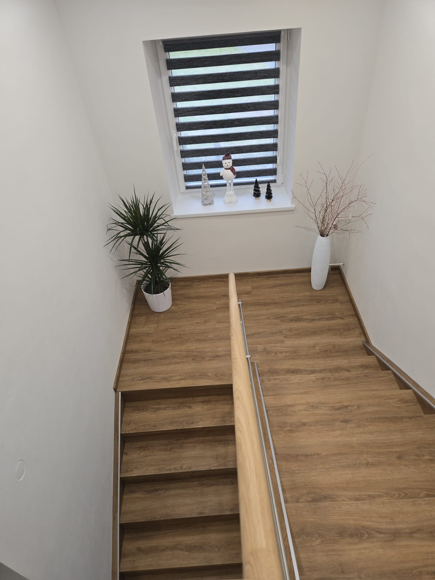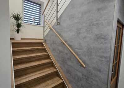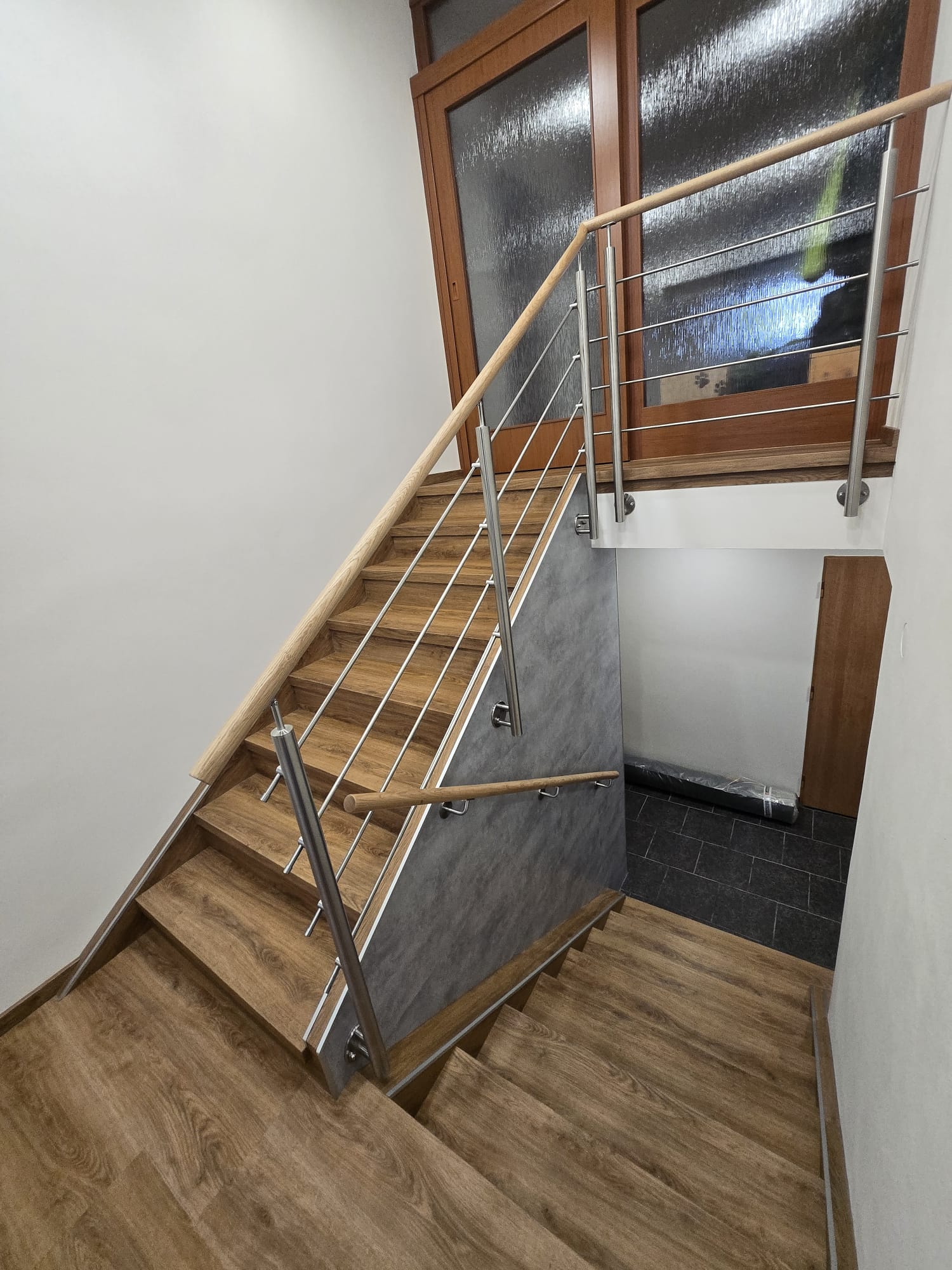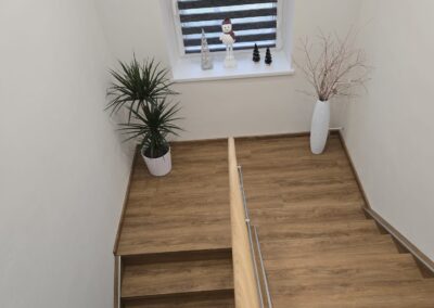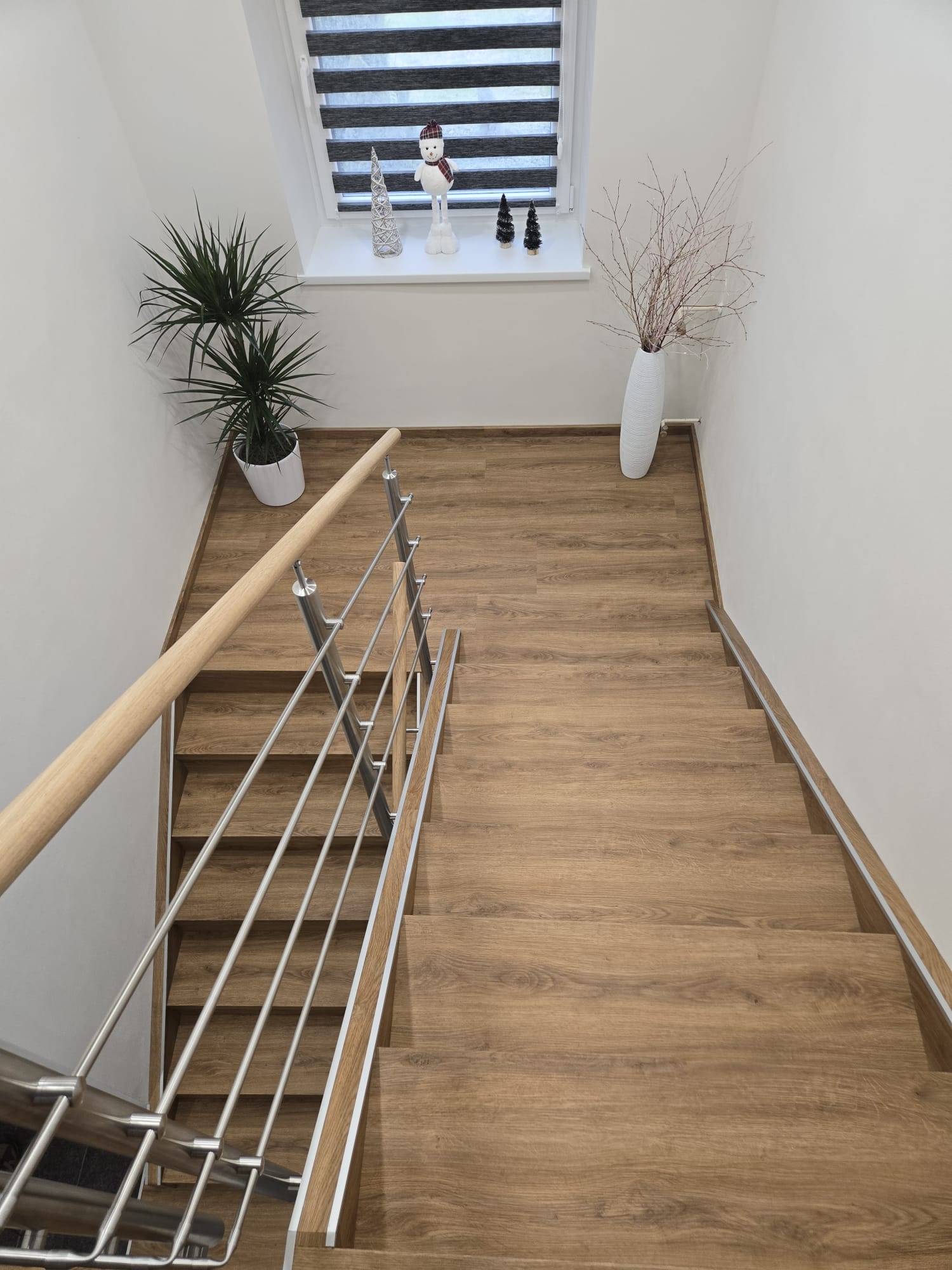 Staré schody jsme oblékli do nových vinylových stupňů, stěnám dopřáli stylový vinylový kabátek a celé to korunovali vkusným zábradlím, které ví, že méně je někdy víc.